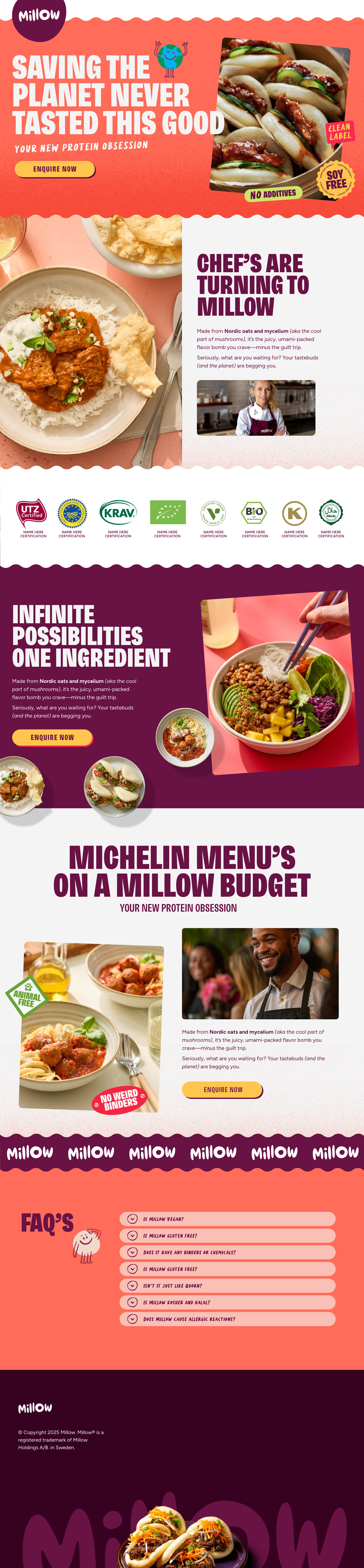 As the brand moved from early R&D into commercial readiness, we evolved its messaging across website design and social media presence—helping Millow stand apart in a rapidly growing but crowded alternative protein space. From science-backed storytelling to a clear, scalable identity, we’ve laid the foundation for a brand that is as pioneering as the product it champions. A defining feature of the Millow experience is the use of playful, character-driven illustrations that appear across their website and digital content. These visuals, animated and expressive, help communicate complex science with warmth and simplicity—bringing personality and human touch to a brand driven by biotech innovation.